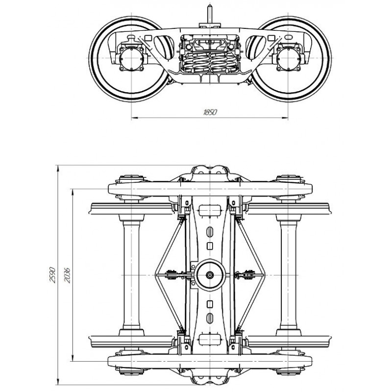 дополнительное гашение возмущающих усилий, а также улучшены общие динамические характеристики. Скользуны постоянного контакта обеспечивают постоянный момент сопротивления вилянию тележек под вагоном.Производитель АО "Алтайвагон" Покомпонентный вид в перспективе тележки