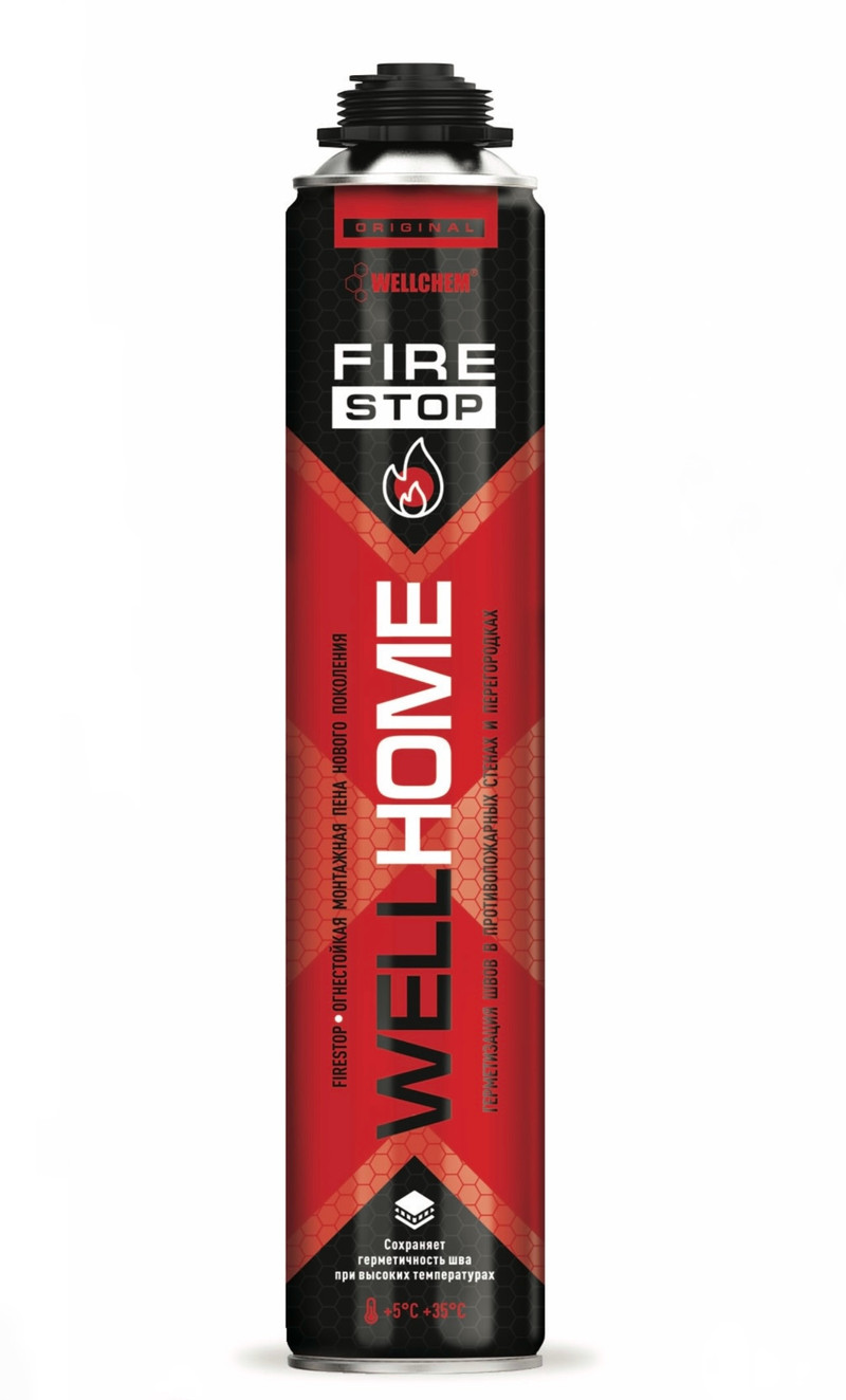 Однокомпонентная огнезащитная пенополиуретановая пена WELLHOME FIRESTOP предназначена для создания огнестойкой изоляции, защиты от повышенных и высоких температур, а также для эффективной герметизации от дыма и газов стен огнестойких. Имеет отличную адгезию ко многим строительным материалам (кроме тефлона, полиэтилена, льда). Сопротивляемость к открытому огню достигает до 240 минут (предел огнестойкости). Пистолетная пена даёт возможность точного дозирования и гарантирует точный высокий выход. Обладает высокой адгезией к большинству строительных материалов, таких как: бетон, кирпич, штукатурка, дерево, пластик, за исключением полиэтилена, тефлона льда. Обспечивает равномерный, стабильный выходи идеальную мелкопористую структуру готовой пены. Создаёт превсходную тепло- и звукоизоляцию. Не деформирует конструкцию благодаря низкому давлению при расширении.
