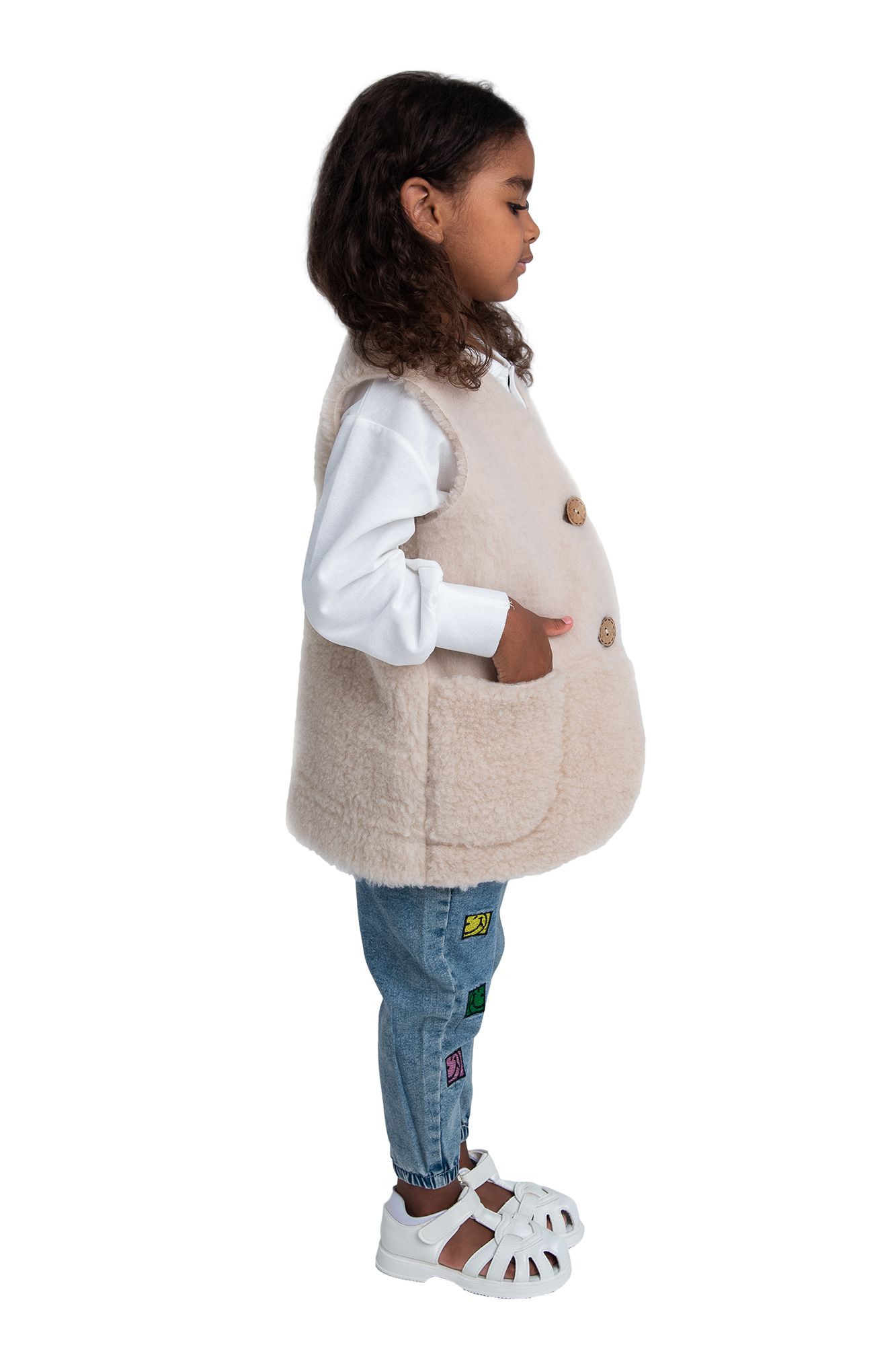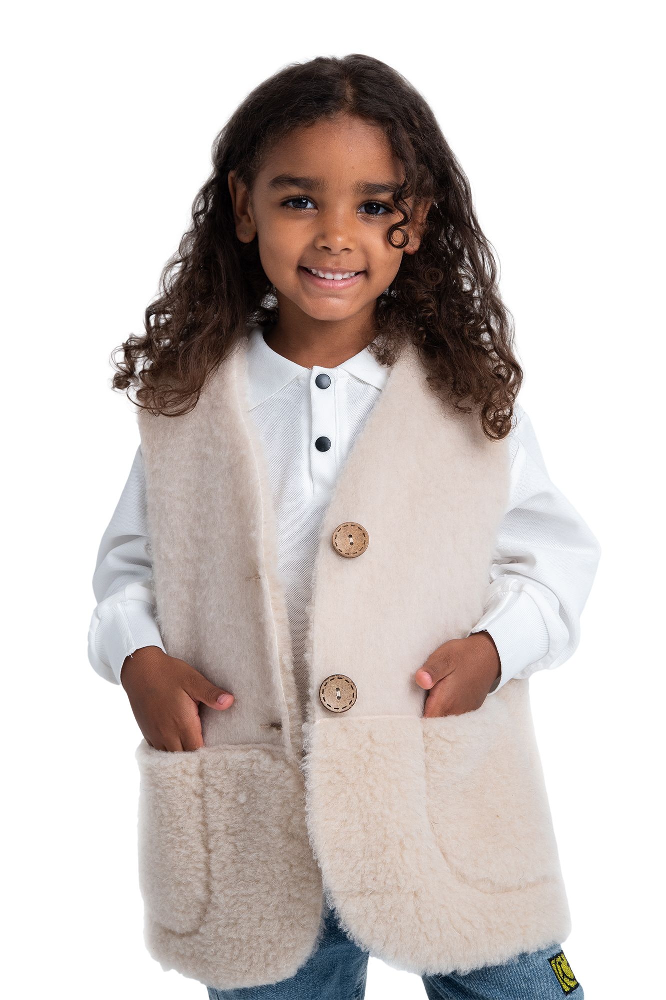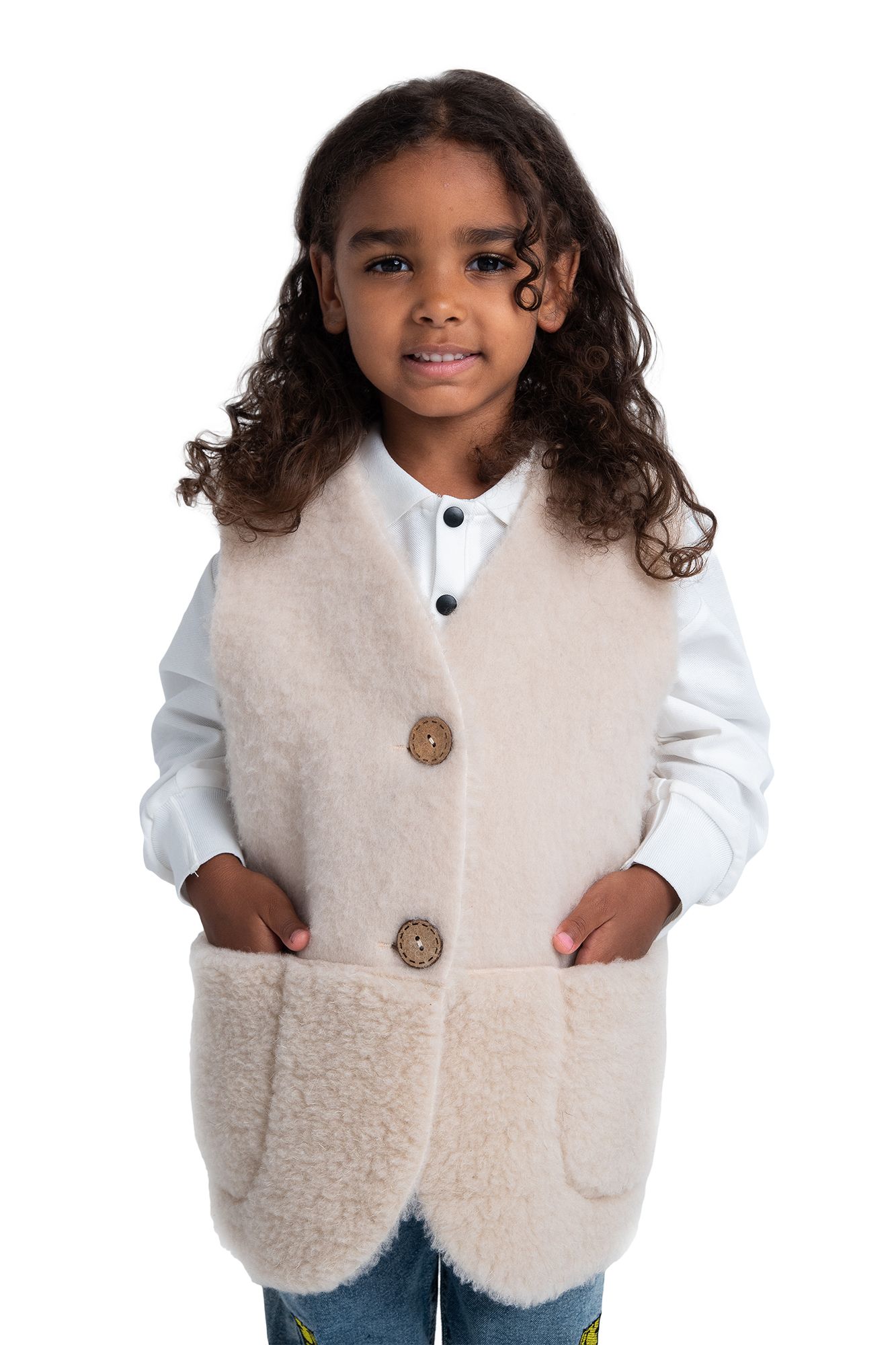 Если дома или в детском саду прохладно, очень выручит меховой жилет из тёплой овечьей шерсти. Дети терпеть не могут, когда на них надевают одежду в несколько слоев, что стесняет движения. Зато легкий жилет совершенно не будет ощущаться и мешать. При этом он надежно защитит малыша от холода и сквозняков., Выбор натуральных тканей для детей самый удачный. Воздействие овечьей шерсти хорошего качества целебно. Оно окутывает сухим комфортным теплом. Тело не перегревается и свободно дышит., Жилет легко снимается, застегиваясь спереди на пуговицы. По бокам есть два кармана, куда малыш спрячет носовой платок и кучу других полезных вещей.