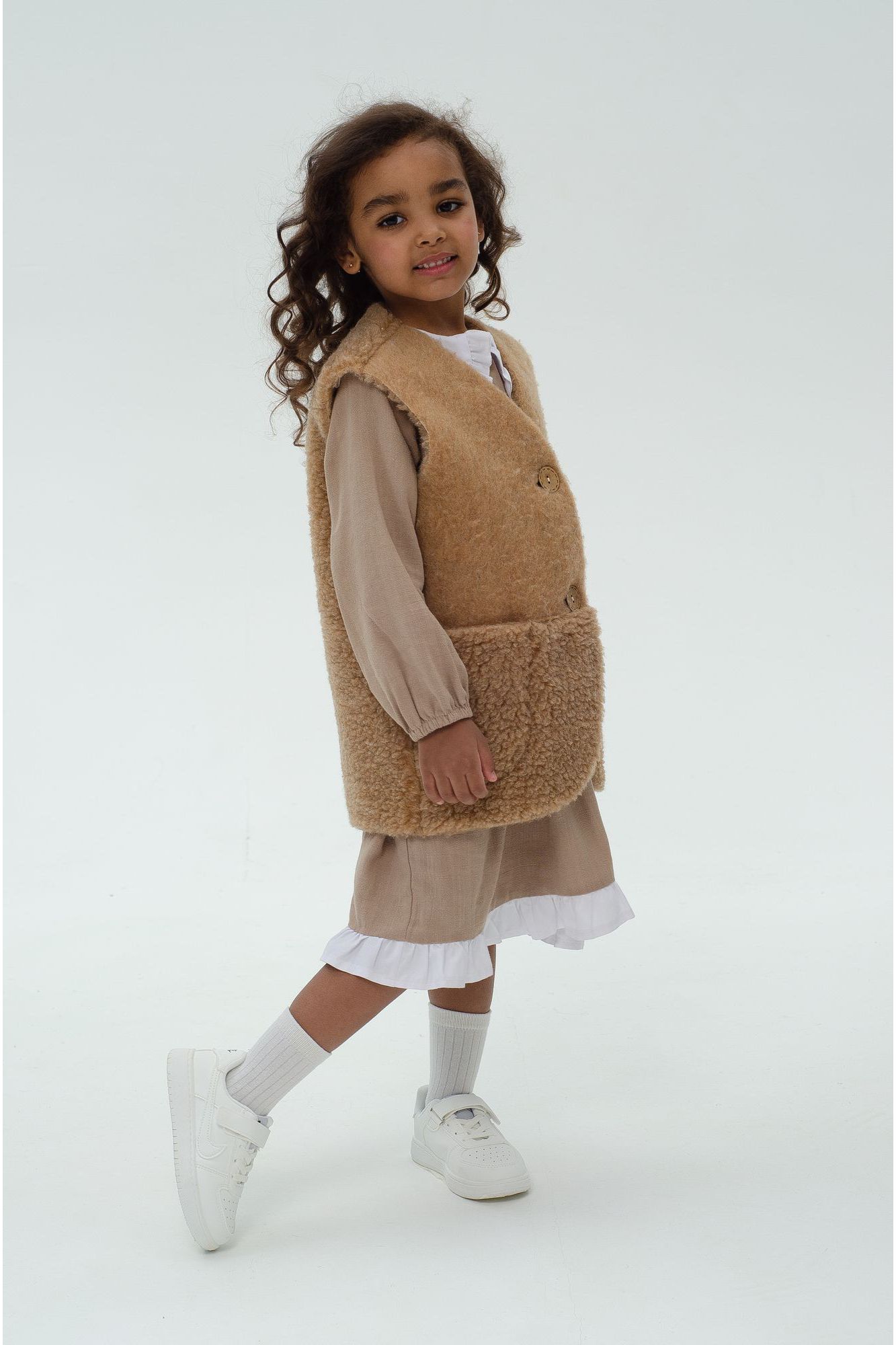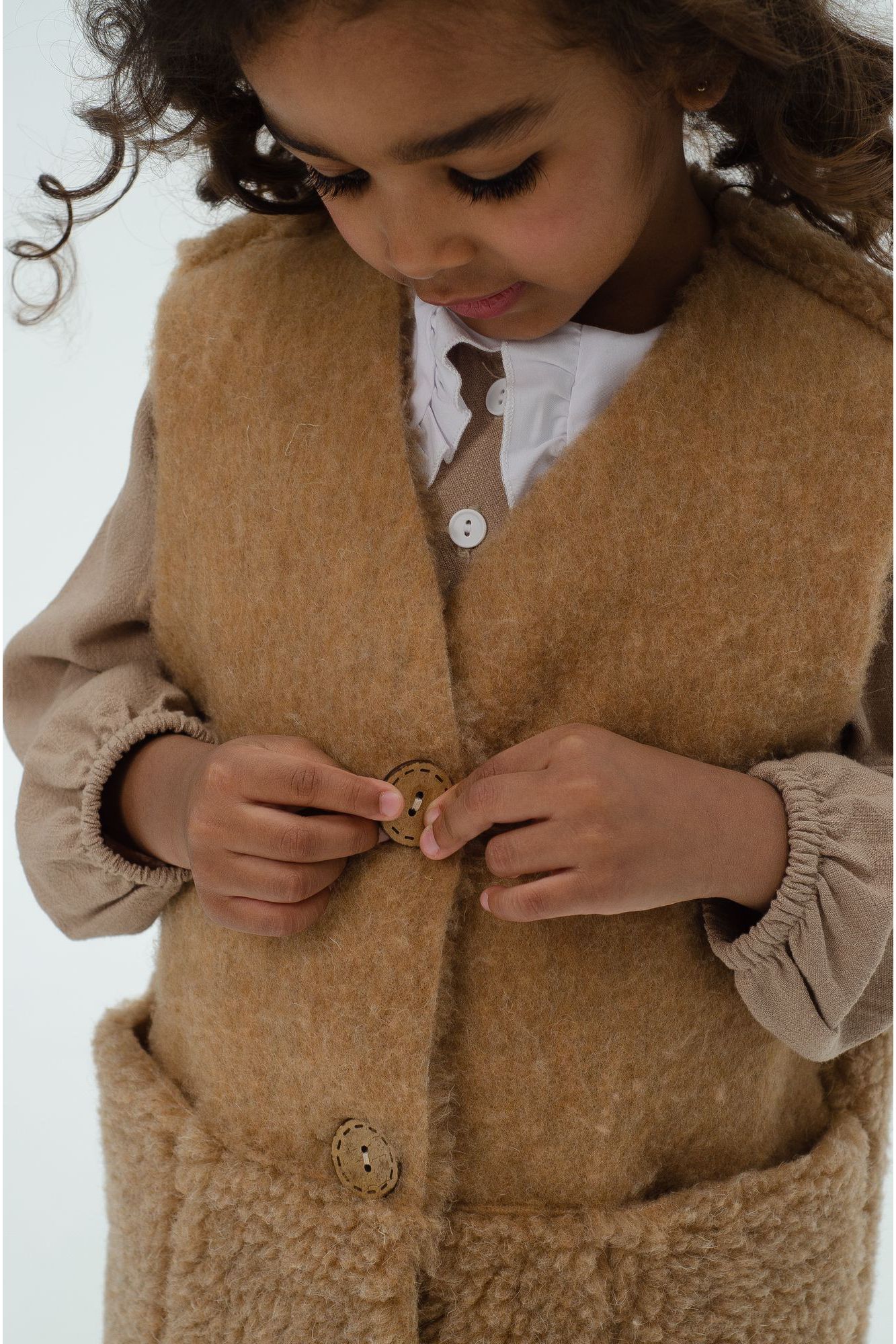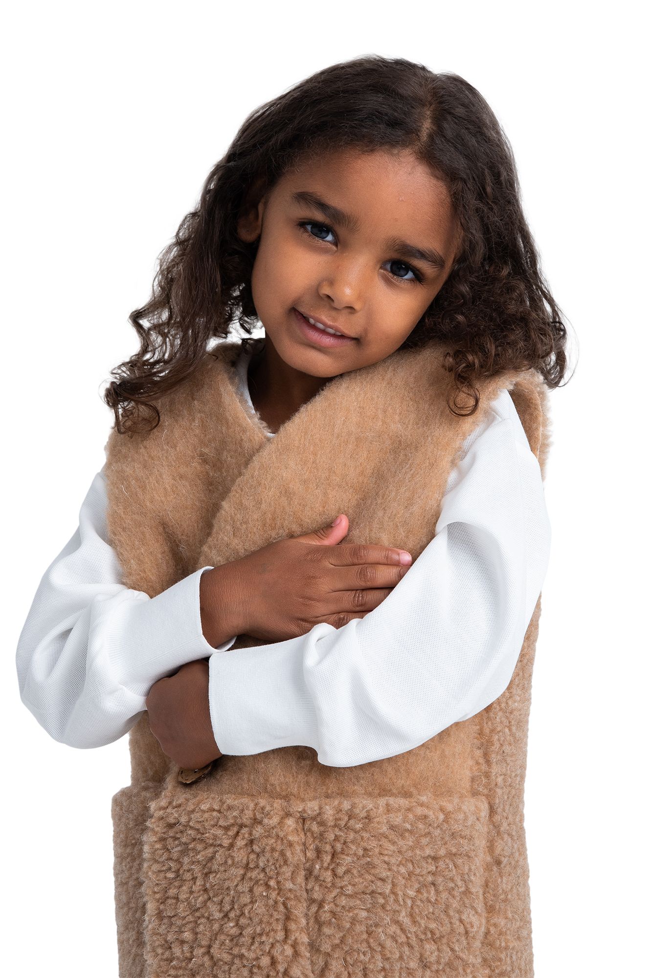 Если дома или в детском саду прохладно, очень выручит меховой жилет из тёплой овечьей шерсти. Дети терпеть не могут, когда на них надевают одежду в несколько слоев, что стесняет движения. Зато легкий жилет совершенно не будет ощущаться и мешать. При этом он надежно защитит малыша от холода и сквозняков., Выбор натуральных тканей для детей самый удачный. Воздействие овечьей шерсти хорошего качества целебно. Оно окутывает сухим комфортным теплом. Тело не перегревается и свободно дышит., Жилет легко снимается, застегиваясь спереди на пуговицы. По бокам есть два кармана, куда малыш спрячет носовой платок и кучу других полезных вещей.