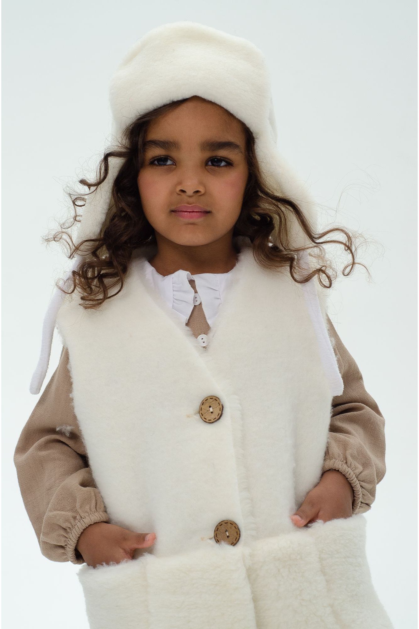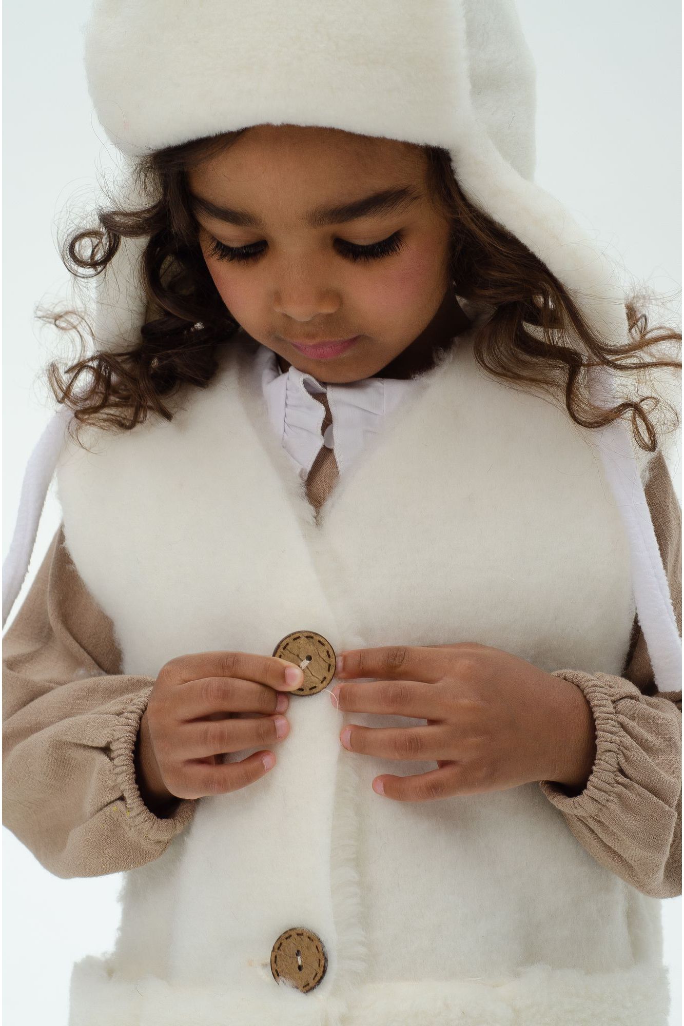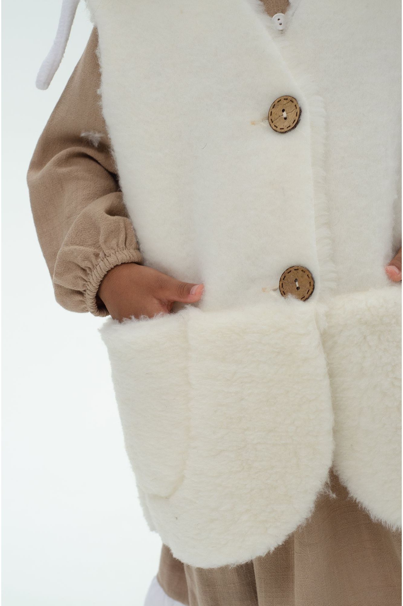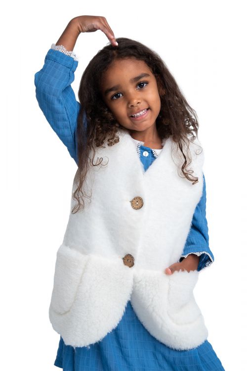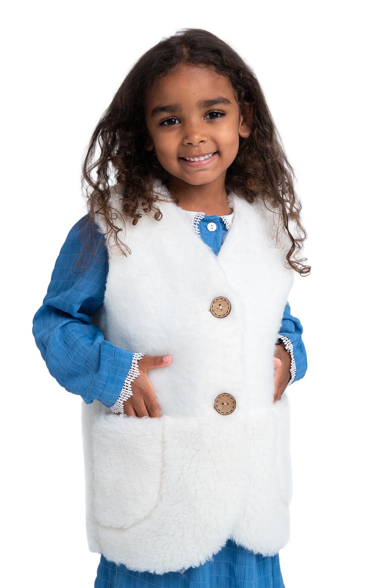 Если дома или в детском саду прохладно, очень выручит меховой жилет из тёплой овечьей шерсти. Дети терпеть не могут, когда на них надевают одежду в несколько слоев, что стесняет движения. Зато легкий жилет совершенно не будет ощущаться и мешать. При этом он надежно защитит малыша от холода и сквозняков., Выбор натуральных тканей для детей самый удачный. Воздействие овечьей шерсти хорошего качества целебно. Оно окутывает сухим комфортным теплом. Тело не перегревается и свободно дышит., Жилет легко снимается, застегиваясь спереди на пуговицы. По бокам есть два кармана, куда малыш спрячет носовой платок и кучу других полезных вещей.