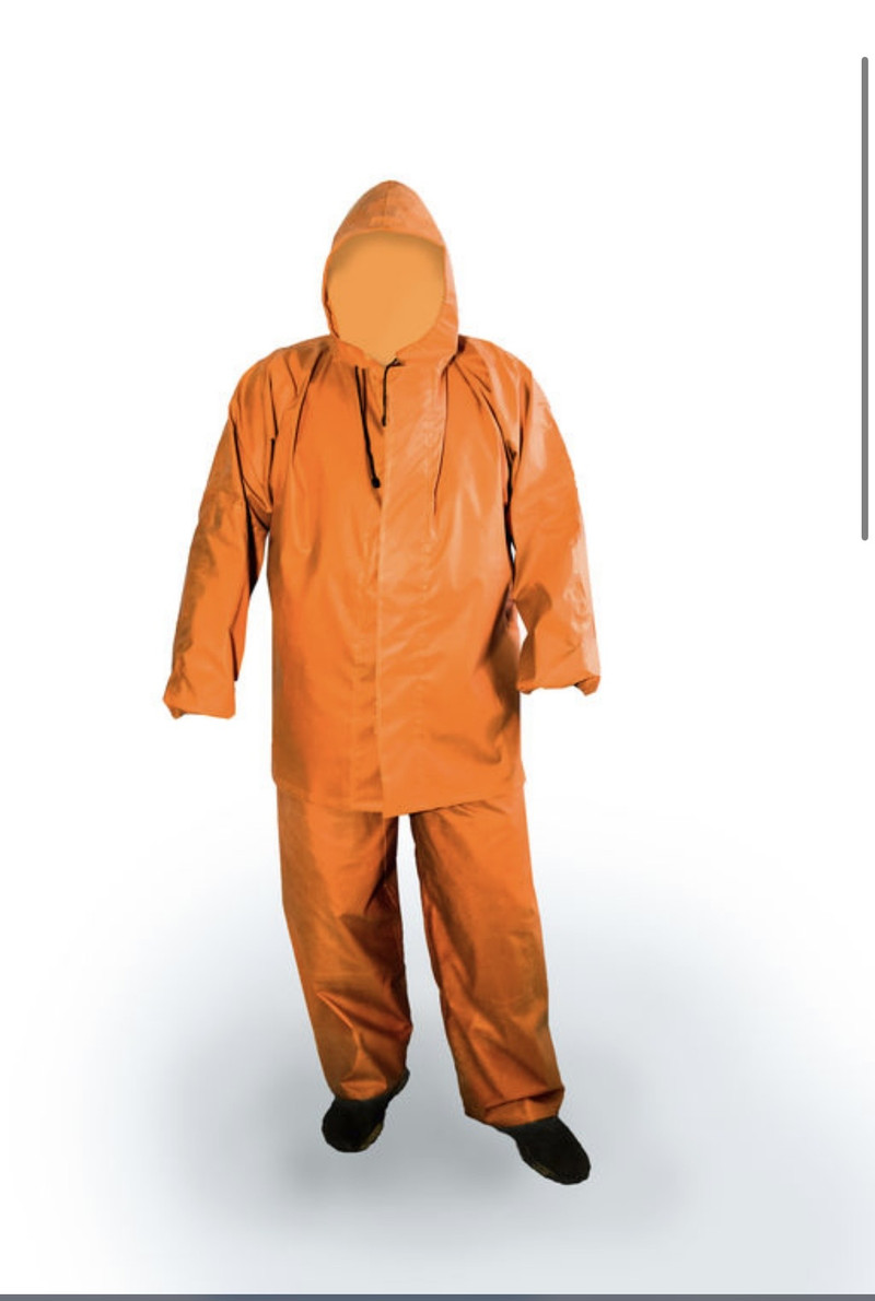 Изготовлен из прорезиненной ткани арт.1045, оранжевого цвета, плотностью 500 г стойкой к морской воде и рыбьему жиру. Состоит из куртки с капюшоном,