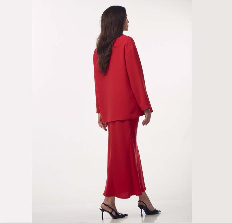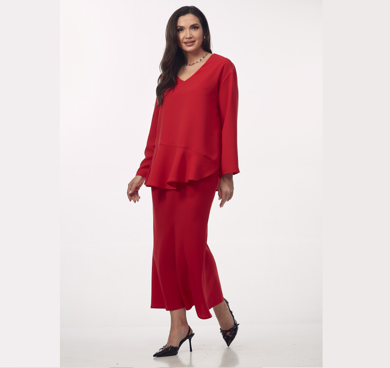 Этот элегантный юбочный костюм-двойка станет ярким акцентом вашего гардероба. Блуза свободного силуэта, с классическим V-образным вырезом горловины, который визуально удлиняет шею. По переду бузы оригинальная асимметричная баска, переходящая в мягкий вертикальный волан. Рукав втачной со спущенным плечом. Длина рукава с плечом для роста 164 см 68 см, для роста 170 см 70 см. Юбка облегающая бедра с расклешеним к низу. Пояс на круговой резинке. Длина юбки от талии для роста 164 см 97 см, для роста 170 см100 см.