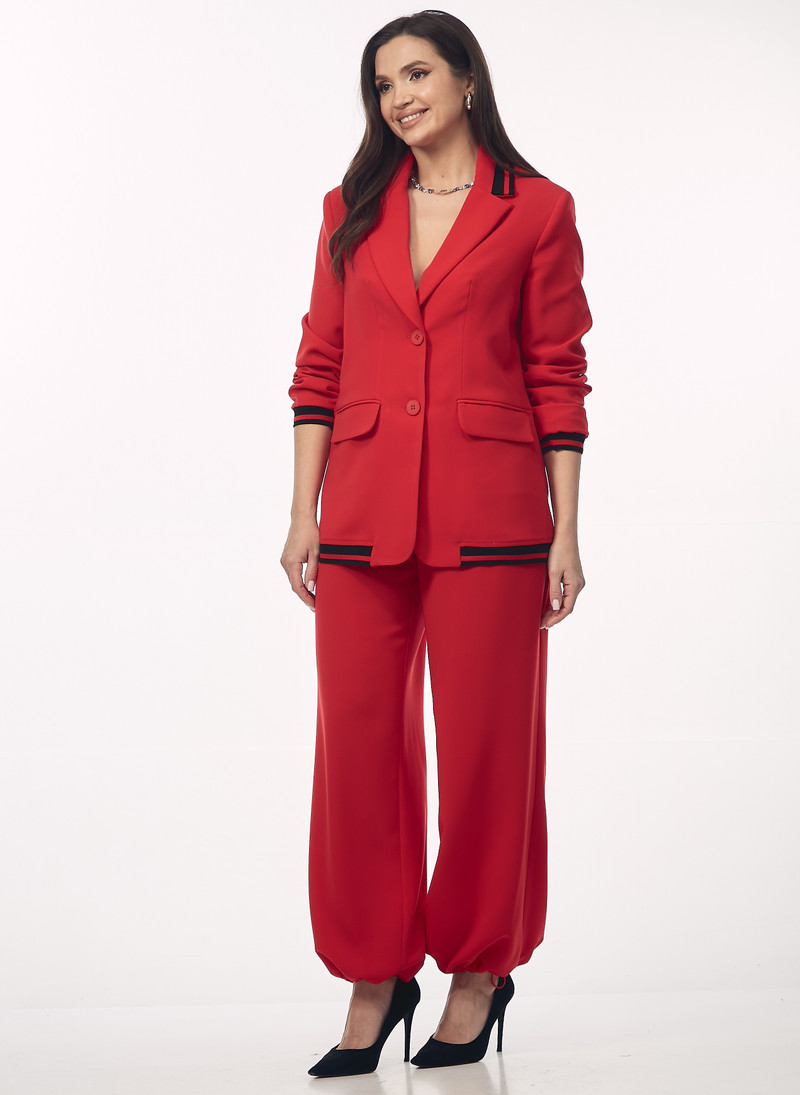 Женский брючный костюм станет стильным и эффектным решением для вашего гардероба. Модель сочетает в себе классический крой с современными спортивными элементами, что делает её универсальной как для офиса, так и для неформальных встреч. Жакет однобортный, прямого силуэта с воротником пиджачного типа и центральной застежкой на пуговицы. Уникальность модели подчеркивают контрастные чернокрасные полосатые довязы на воротнике, по низу рукава, и по нижнему краю жакета. Имеются функциональные карманы с клапанами. Рукав втачной. Длина рукава от плеча для роста 164 см 61 см, для роста 170 см 63 см. Длина жакета от плеча по спинке для роста 164 см 70 см, для роста 170 см72 см. Брюки прямые, с карманами в боковых швах. Пояс - довяз. По низу брюк вставлена тесьма-резинка круглая с фиксатором (для изменения формы брюк). Длина брюк от талии для роста 164 см 107 см, для роста 170 см 110 см.