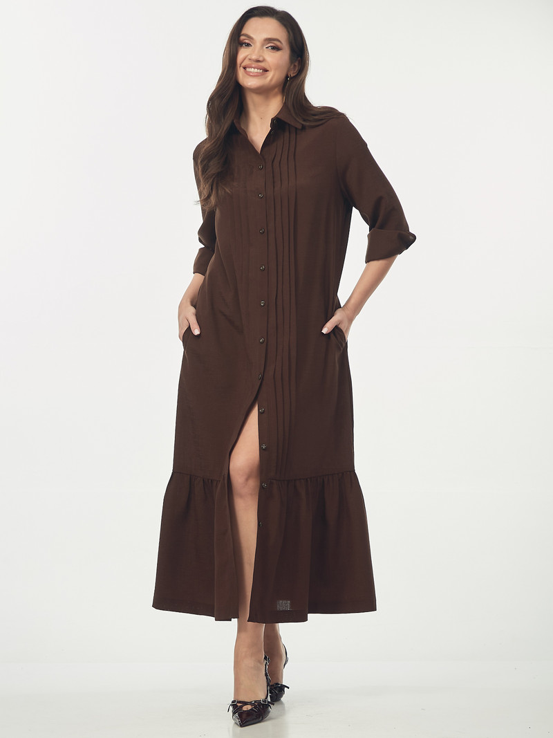Платье-рубашка свободного силуэта. Воротник рубашечный. Центральная застежка на пуговицы по всей длине переда. Декоративные вертикальные складки вдоль планки визуально вытягивают силуэт. В боковых швах расположены карманы. Отрезная нижняя часть оформлена широким воланом, что придает образу женственности и легкости при ходьбе. Рукав втачной, заканчивается аккуратными манжетами на пуговицах. Длина рукава от плеча для роста 164 см 61, для роста 170 см 63 см. Длина платья от плеча по спинке для роста 164 см 130 см, для роста 170 см 134 см.