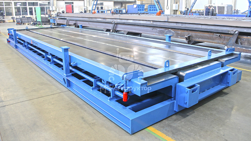 В основании силовая рама, что необходимо при работе с преднатяжением. Соответственно, для запуска арматуры на торцах установлены силовые упоры и защитные кожухи, необходимые для исключения несчастного случая при обрыве арматуры или каната.