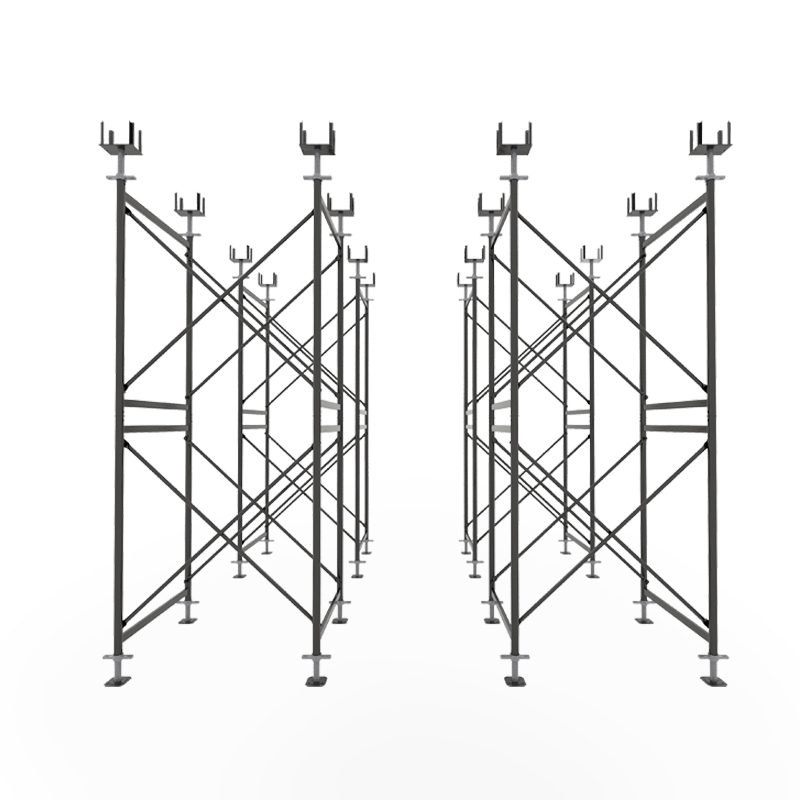 Рамная опалубка состоит из несущих рам, которые соединяются диагональными связями с помощью флажкового замка. По высоте рамы стыкуются с помощью соединительных вставок. Для более точной настройки высоты используются регулировочные опоры и унивилки.