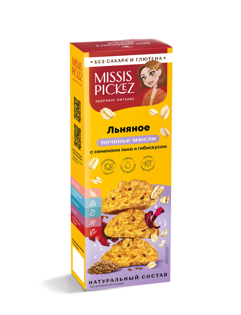 Необычный и полезный перекус. Съев его, вы получите не только удовольствие, но и заряд полезных веществ. Семена льна богаты клетчаткой и омега-3 жирными кислотами. Гибискус дополняет это нежное печенье и за счет антоцианов укрепляет стенки сосудов и защищает их от вредного холестерина. Отлично подходит для здорового перекуса, так как не содержит сахар, глютен, лактозу и яйца.