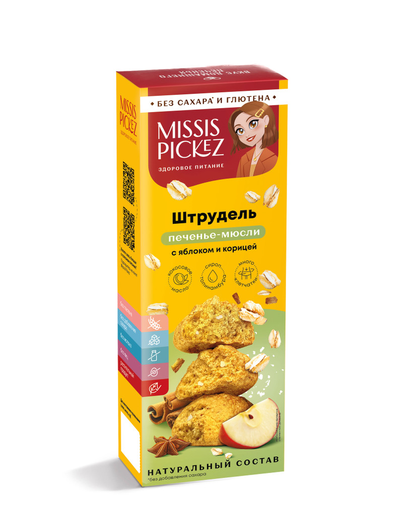 Вкусное печенье с ароматом домашнего штруделя — яблоко и корица создают это уютное сочетание. В составе нет глютена — вместо пшеничной используются рисовая мука, овсяные хлопья и отруби, являющиеся природным источником клетчатки, важной для организма. Печенье сладкое без добавления сахара благодаря сиропу топинамбура, который обеспечивает мягкую сладость. Отлично подходит для лёгкого перекуса, особенно в паре с чаем или кофе.