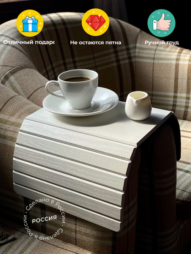 Столик подходит для подлокотников прямой, округлой и комбинированной формы, плотно фиксируется благодаря гибкой конструкции и заменяет собой журнальный столик, экономя пространство.