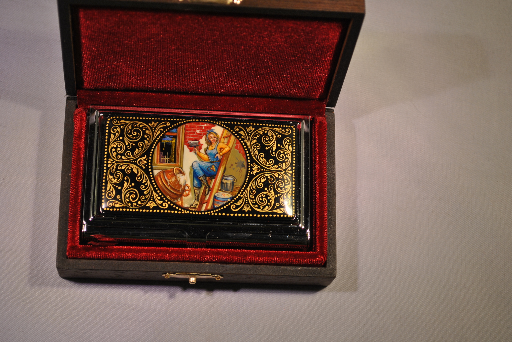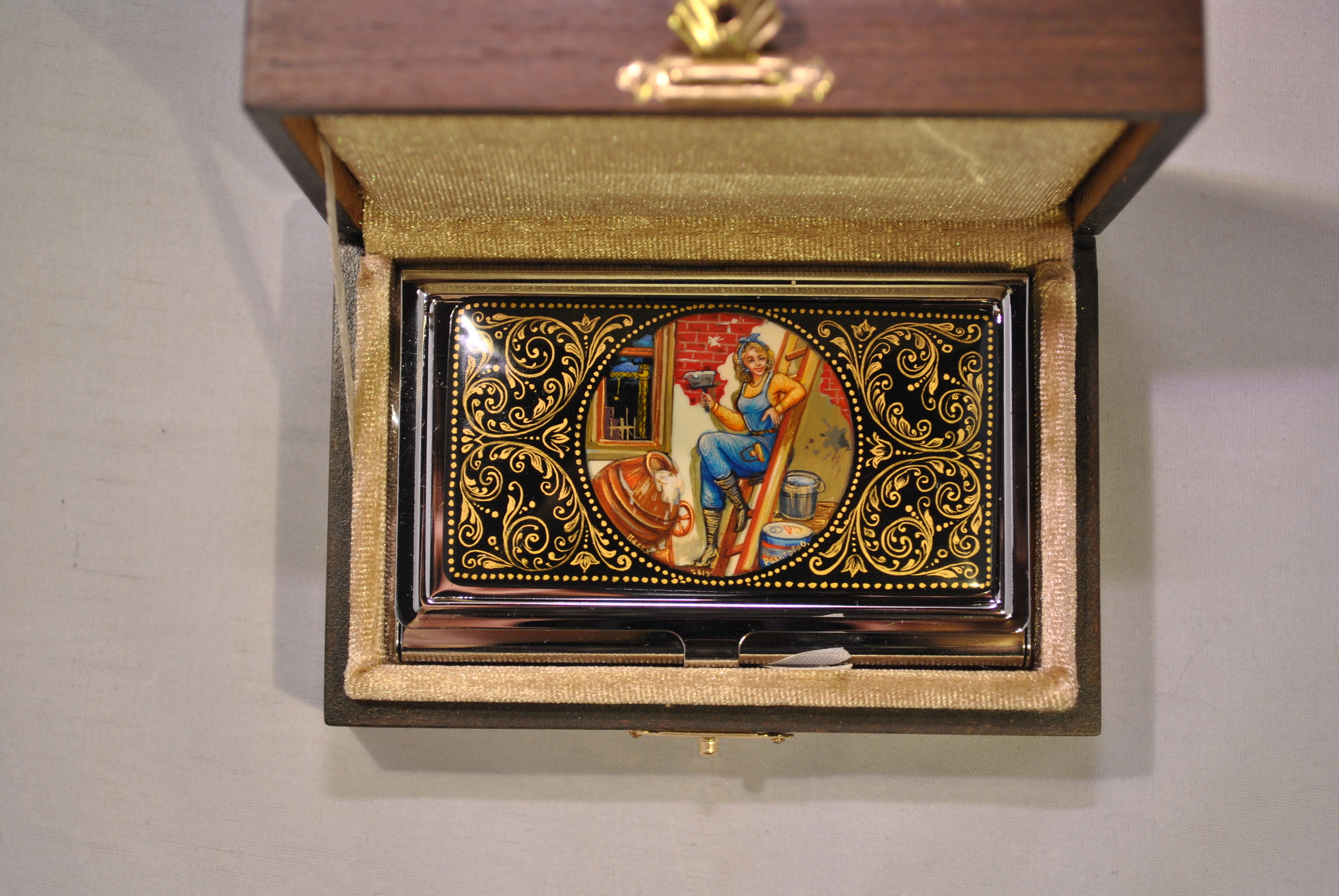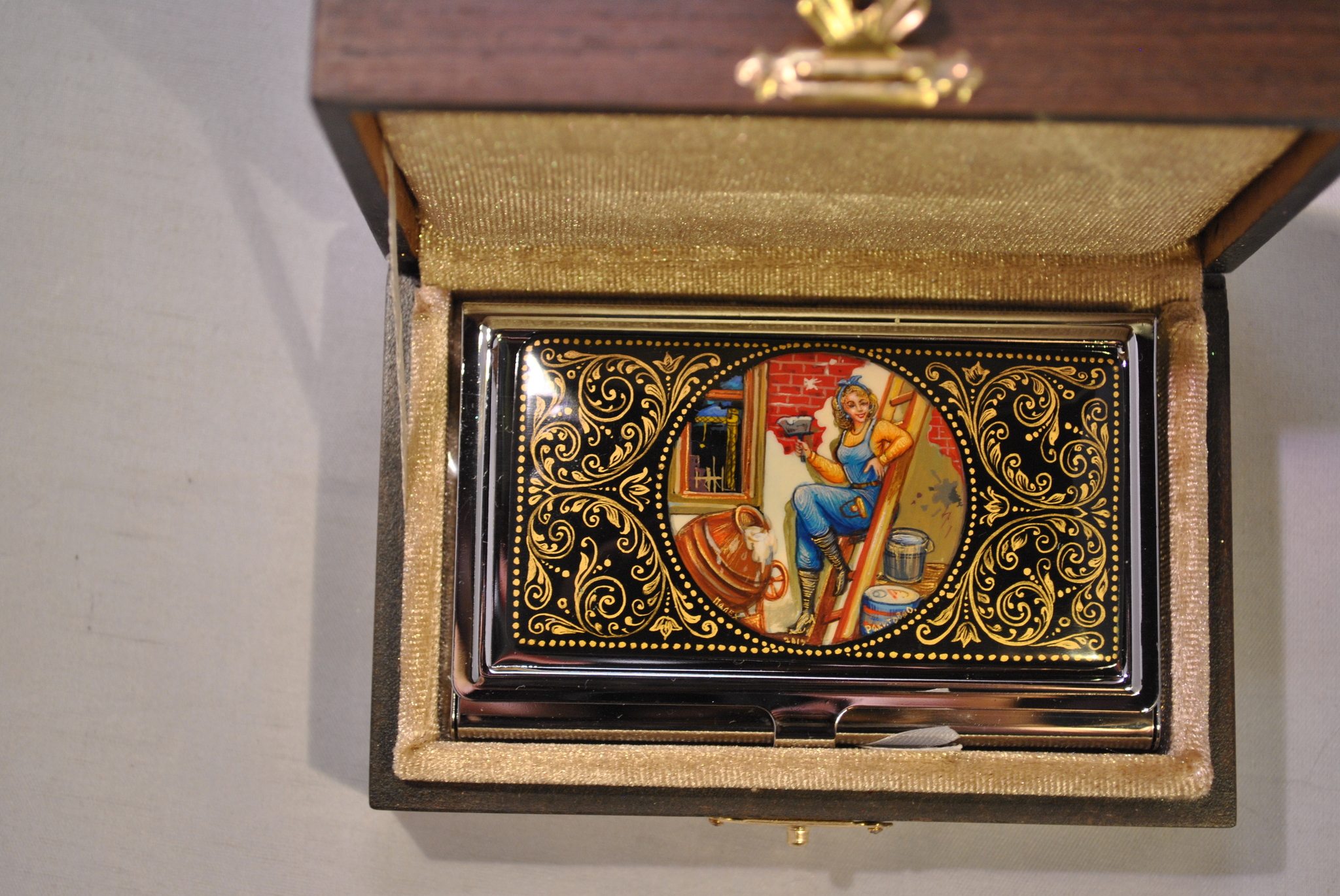 Предлагаем вам купить замечательную визитницу "Строитель" металлическую, украшенную традиционной ручной росписью Палех.