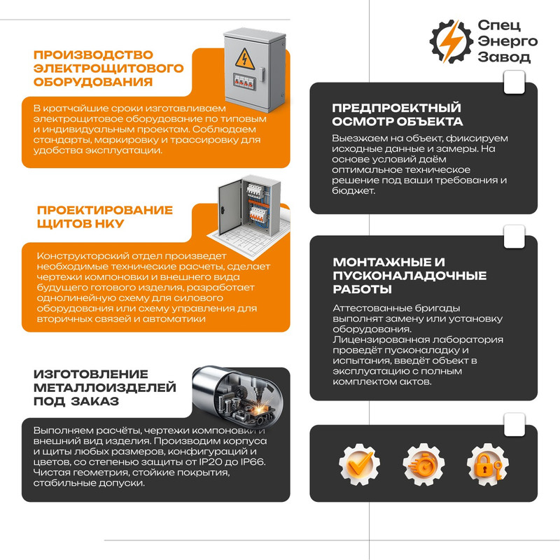 СпецЭнергоЗавод — производство электрощитового оборудования и шкафов управления для объектов строительства, промышленности и энергетики. Производим и продаем корпуса электрощитов, электрошкафов из мет...