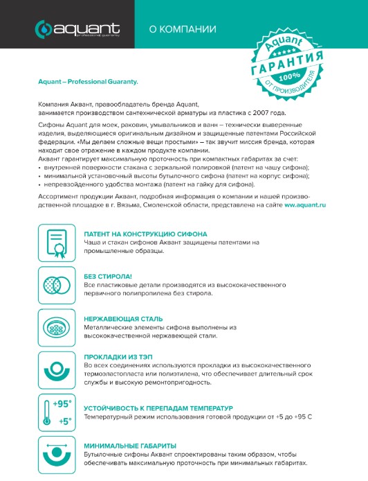 Компания “AQUANT” занимается производством сантехнической арматуры из пластика с 2007 года. Новейшее оборудование от ведущих европейских производителей позволяет нам предлагать товары высокого качеств...