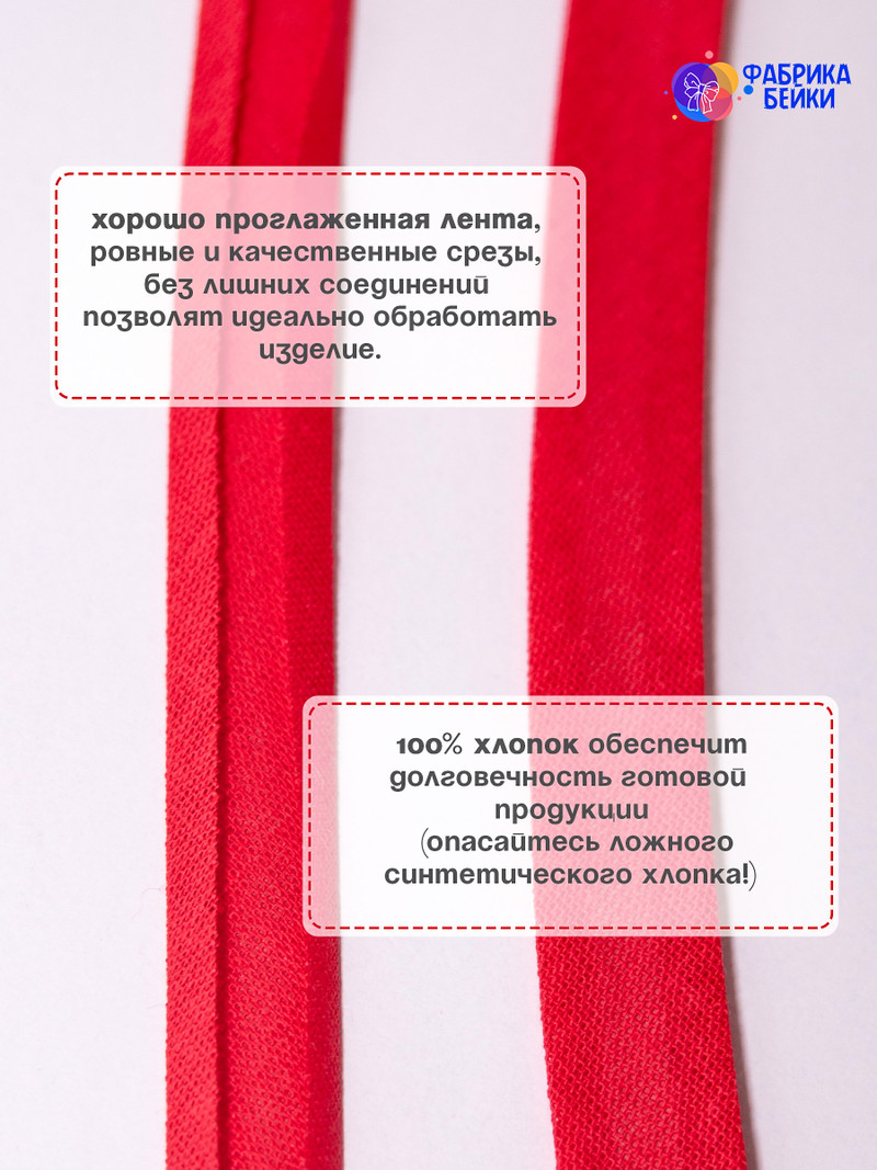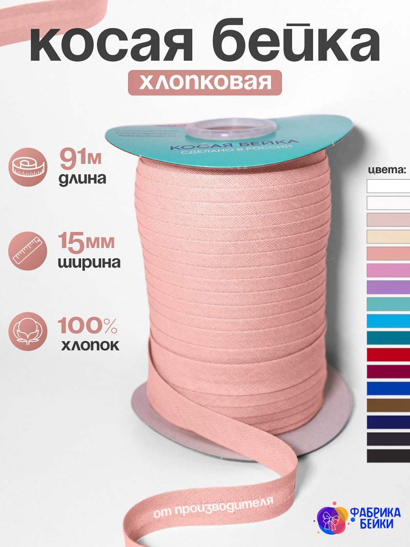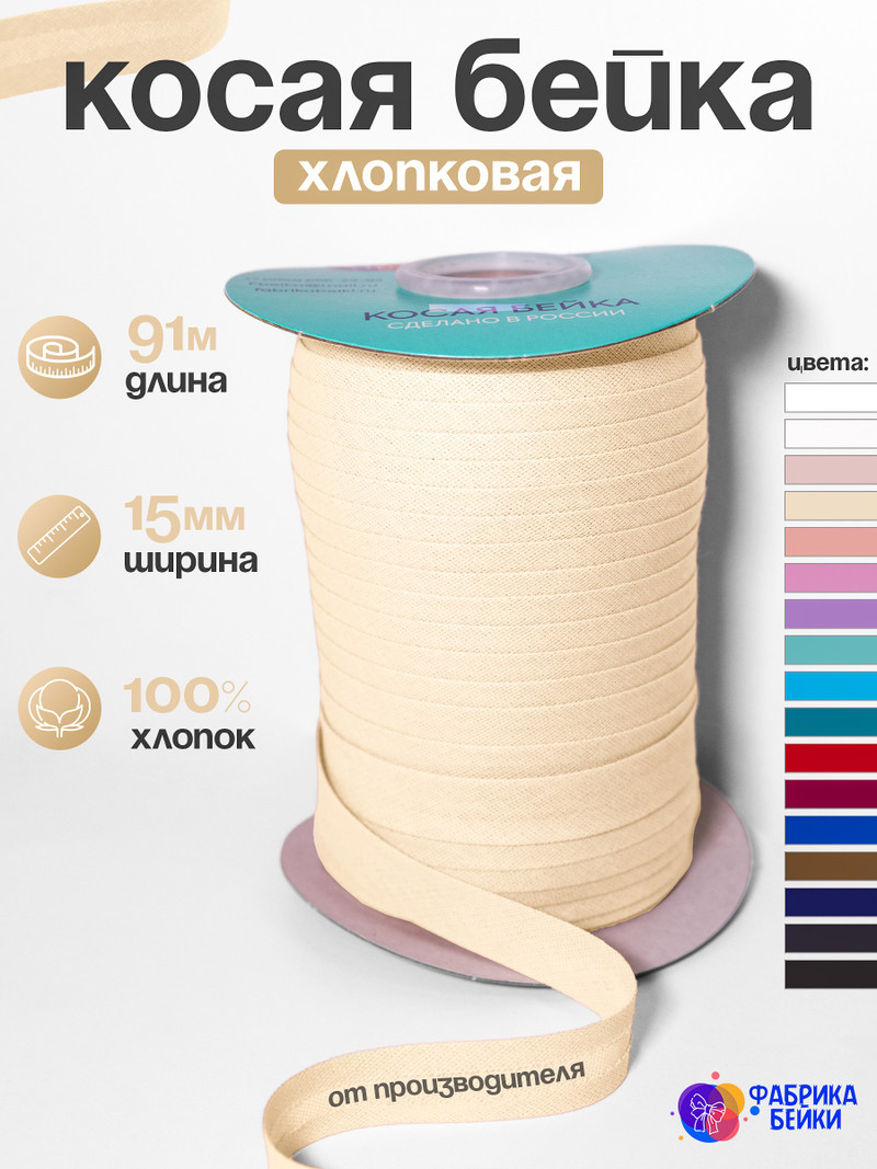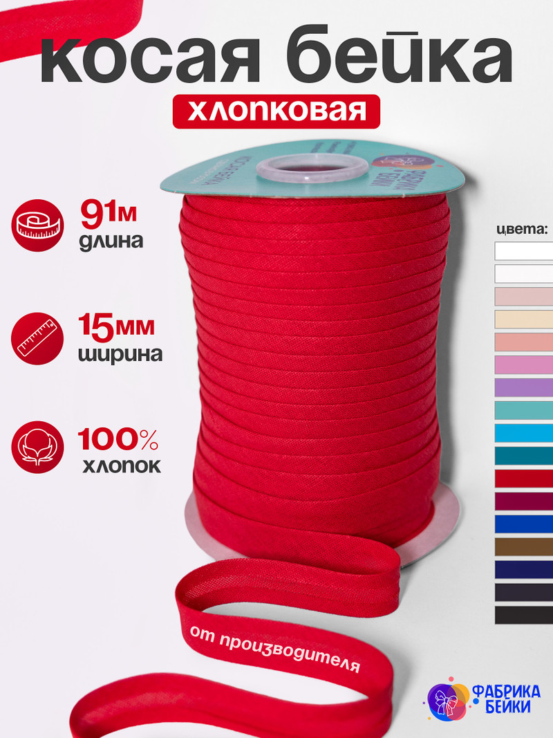 Производство и оптовая продажа косой бейки хлопковой от производителя. В наличии большой ассортимент цветов и длины. Основные позиции 15 мм 91 и 132 метра. Работаем Юр и физ лицами. Будем рады сотрудн...
