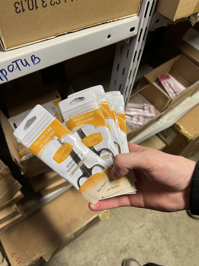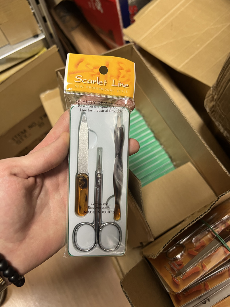 В наличии большое разнообразие маникюрных пренадлежностей, наборов для чистки обуви, ножницы, расчестки