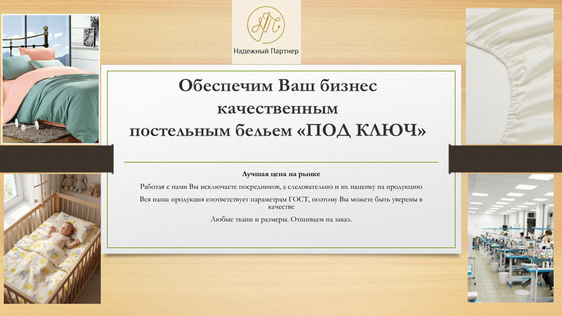 Мы являемся текстильной компанией “День и Ночь” по производству постельного белья и домашнего трикотажа вот уже более 8 лет. В своей работе мы используем натуральные ткани 100% хлопка. В наличии всегд...